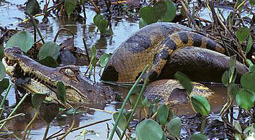 Гигантская анаконда, или большой водный удав, обычно бывает не длиннее 5 метров, но может достигать 11 метров, соперничая в этом с самыми крупными питонами. Желтая анаконда намного меньше. Темно-зеленая с пятнами, гигантская анаконда живет по берегам тропических рек к востоку от Анд и в Тринидаде. Она охотится ночью, подстерегая добычу в воде. Зубами она захватывает жертву и, обвившись вокруг нее, душит, или чаще топит ее в воде. Жертв анаконды выбирают размером с поросенка или каймана. Крупные кайманы, впрочем, и сами не прочь полакомиться мясом анаконды, так же, как и ягуары, часто устраивающие охоту на водных удавов. Нередко раненая в подобных схватках анаконда становится добычей пираний. Но избегнув неприятных встреч, анаконда может дожить до 75 лет.