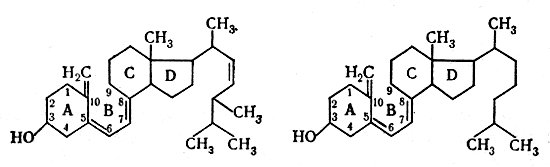 Слева: Витамин D2 (эргокальциферол); справа: Витамин D3 (холекальциферол)