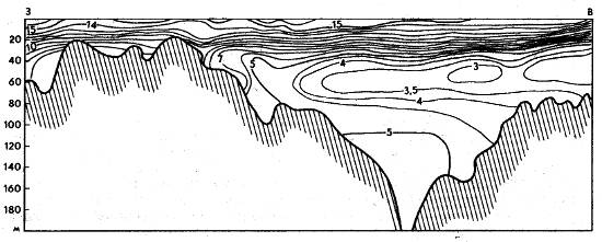 Четко выраженные сезонные изменения температуры воды охватывают только верхние 50—60 м, глубже температура меняется очень мало. В холодный сезон она сохраняется примерно одинаковой от поверхности до горизонтов 50— 60 м, а глубже несколько понижается до дна.