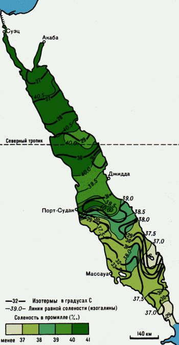 Температура на поверхности моря в холодный сезон возрастает от 18° в Суэцком заливе до 26—27° в центральной части моря, а затем немного понижается (до 24—25°) в районе Баб-эль-Мандебского пролива. Соленость на поверхности понижается от 40—41‰ на севере до 36,5‰ на юге моря.