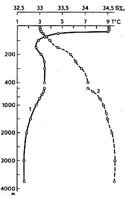 Весной температура воды на поверхности повышается примерно до 3,8° и сохраняется до горизонтов 40—50 м, далее до горизонтов 65—80 м она резко, а затем (до 150 м) очень плавно понижается с глубиной и с глубины 200 м незначительно повышается к дну.