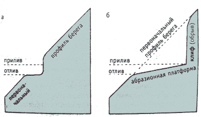 Абразионная платформа, а – ранняя стадия формирования, б – более поздняя стадия формирования.